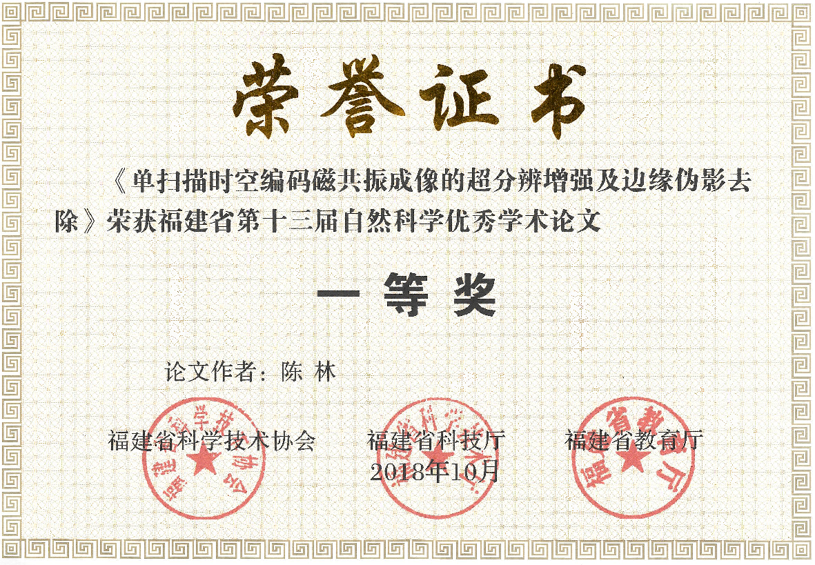 Our paper Chen L, Li J, Zhang M, Cai S, Zhang T, Cai C, Chen Z. Super-resolved enhancing and edge deghosting (SEED) for spatiotemporally encoded single-shot MRI. Med Image Anal 2015;23(1):1-14. won First Prize of the 13th Excellent Academic Paper of Natural Science in Fujian Province.