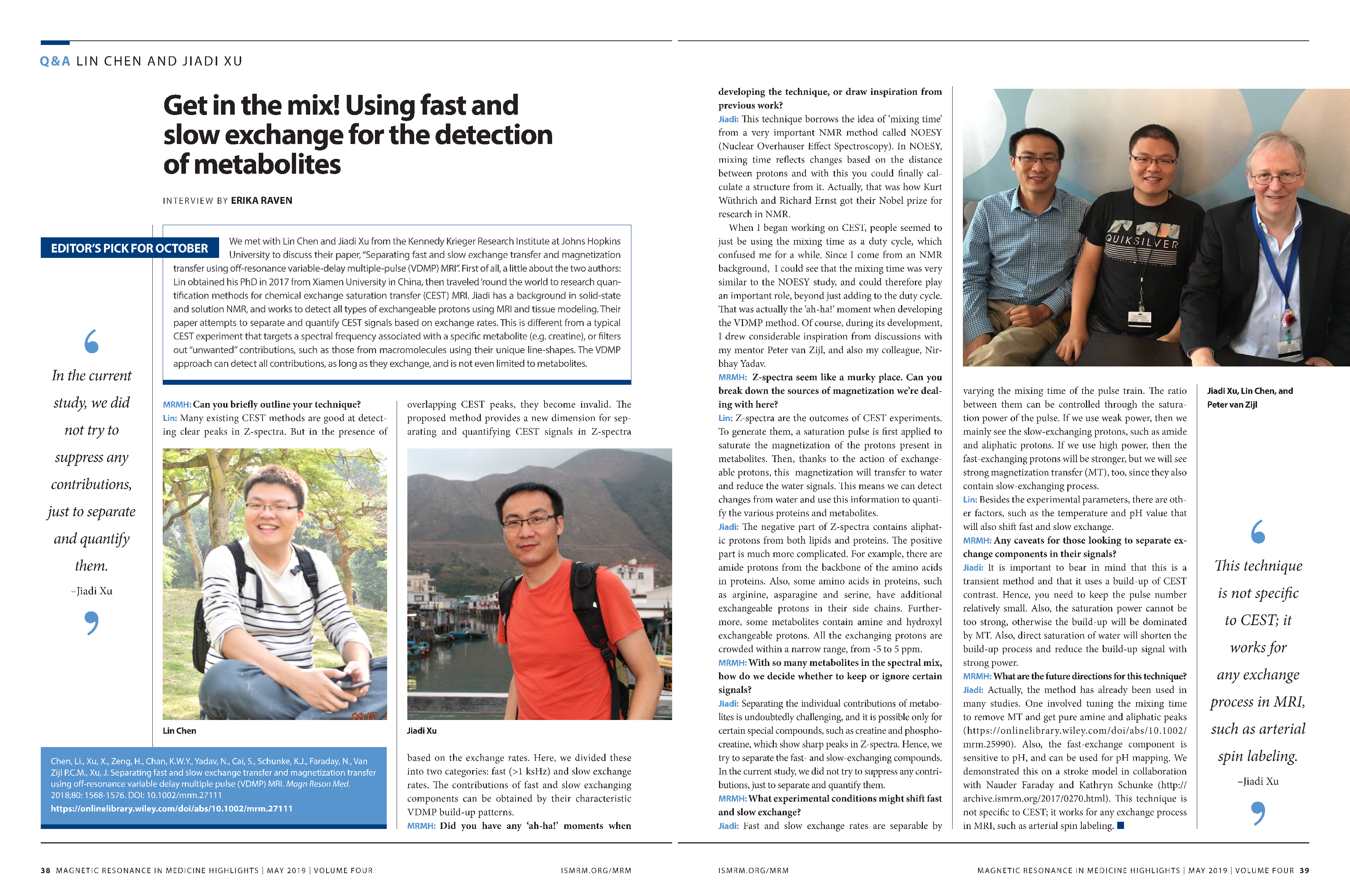 Our paper Chen L, Xu X, Zeng H, Chan KWY, Yadav N, Cai S, Schunke KJ, Faraday N, van Zijl PCM, Xu J. Separating fast and slow exchange transfer and magnetization transfer using off-resonance variable-delay multiple-pulse (VDMP) MRI. Magn Reson Med 2018;80(4):1568-1576. was selected as Editor’s Pick, and ISMRM official blog made a report on this.