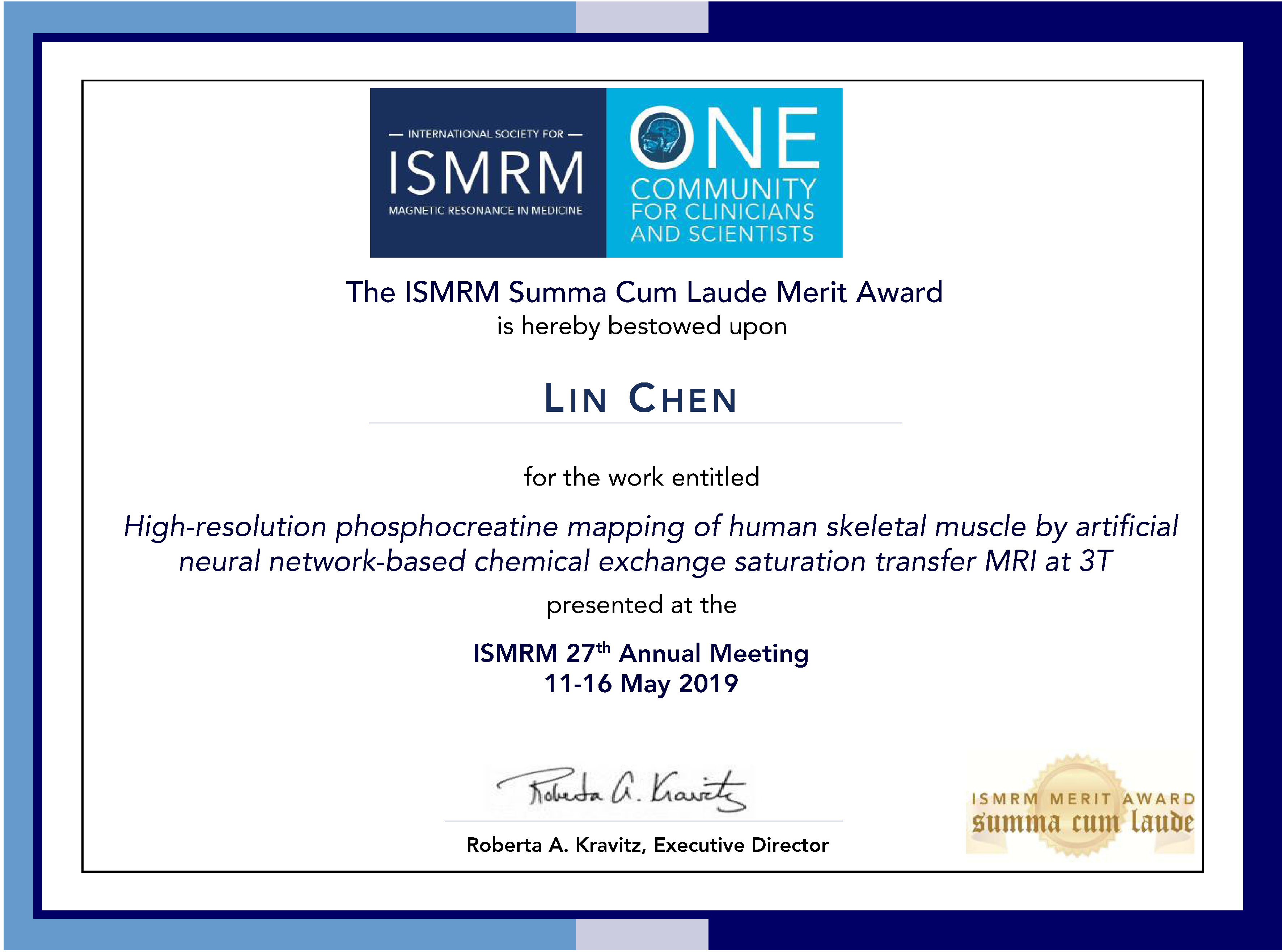 Our work “High-resolution phosphocreatine mapping of human skeletal muscle by artificial neural network-based CEST MRI at 3T” won Summa Cum Laude Merit Award at ISMRM 27th Annual Meeting & Exhibition.